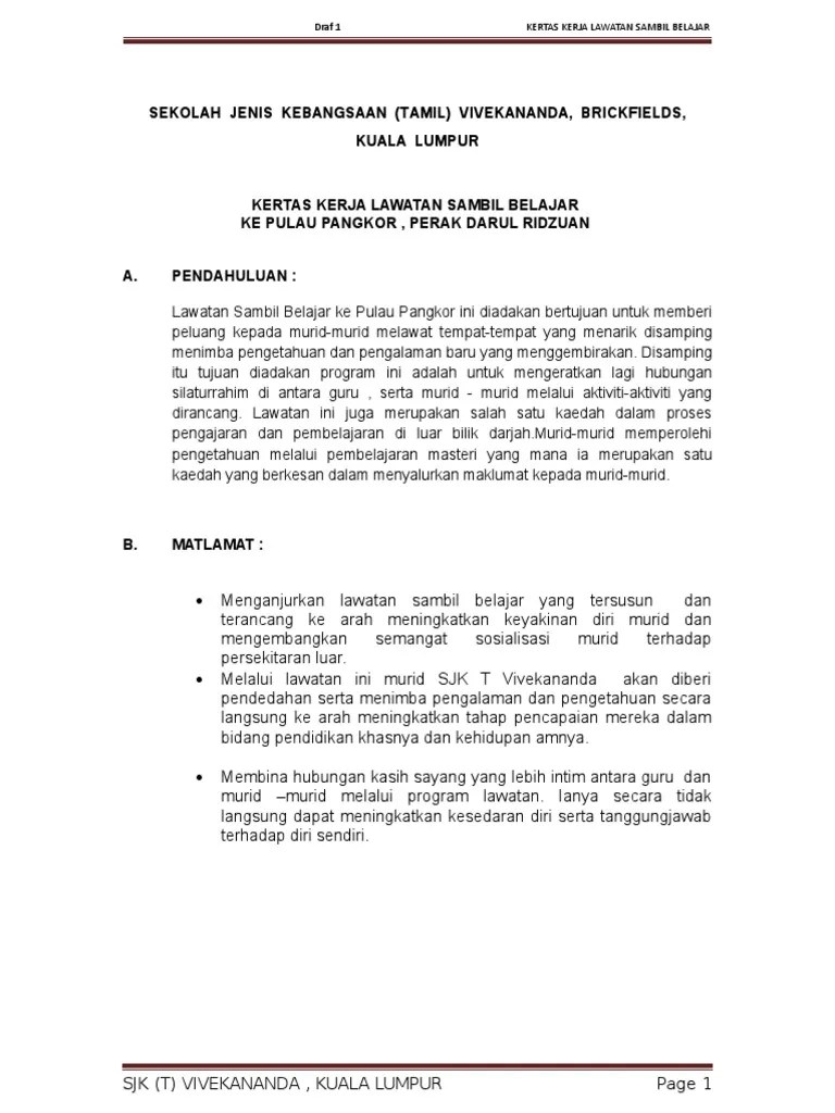 Institut pendidikan guru malaysia, kampus kent, tuaran. Sekolah kebangsaan sungai petani 08000 sungai petani, . "membuka mata, menimba pengalaman, menjana pengetahuan". 3 november 2017 hingga 5 . Text of kertas kerja lawatan sambil belajar. Kertas kerja kertas cadangan disediakan untuk: Format dan contoh lengkap kertas kerja lawatan sambil belajar by zainab_mustapa in types > government & politics, lawatan. Sambil belajar ke muzium marin, akuarium dan galeri ums, dewan bahasa dan pustaka sabah, taman perdana dan taman tun fuad kota . Kertas kerja lawatan sambil belajar ke pusat sains . Cadangan kertas kerja pengajian sains sosial tajuk : Kertas kerja cadangan program lawatan sambil belajar ke shah alam dan melaka 1.0 pendahuluan institusi asrama sinonim sebagai tempat alternatif bagi pelajar . 1.0 aktiviti sebelum lawatan 1.1 mengadakan mesyuarat penubuhan ajk pelaksanaan, berbincang mengena. Guru boleh mengadakan lawatan sambil belajar bagi memberi peluang kepada murid mengkaji, menganalisis dan membuat perbandingan apa yang mereka lihat dan .